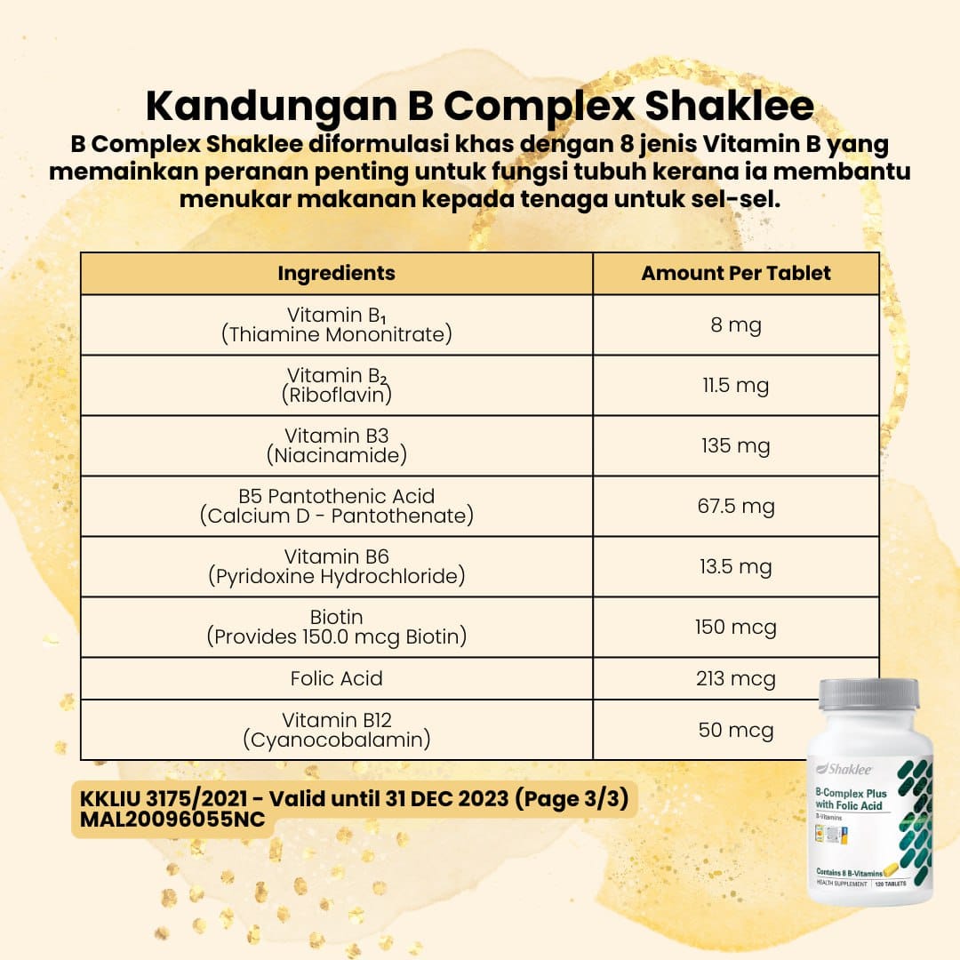 Betul jugak kata ye. Dah dapat B complex kenapa nak suggest ambil lagi. Memang la sama nama Vitamin tu tapi kandungan yang terdapat dalam B complex tu la yg membezakan.. B complex biasa ada 3 saja komponen vitamin B tetapi B complex keluaran Shaklee ada 8 komponen penting vitamin B.