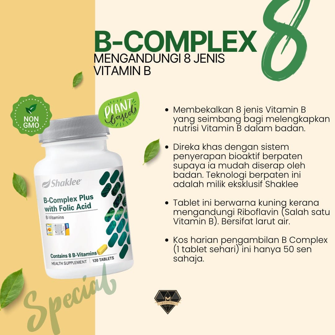 Selain lengkap dengan lapan kumpulan vitamin B , vitamin B Complex Shaklee dilengkapi dengan Sistem penyerapan Boaktif Berpaten iaitu dikenali sebagai asid Folik, sejenis vitamin B yang tidak dapat diserap dengan mudah. Istimewanya B Complex shaklee, ia telah dihasilkan dengan suatu selaput asid folik yang unik untuk menjadikan zat tersebut lebih mudah diperolehi dan digunakan dalam badan.